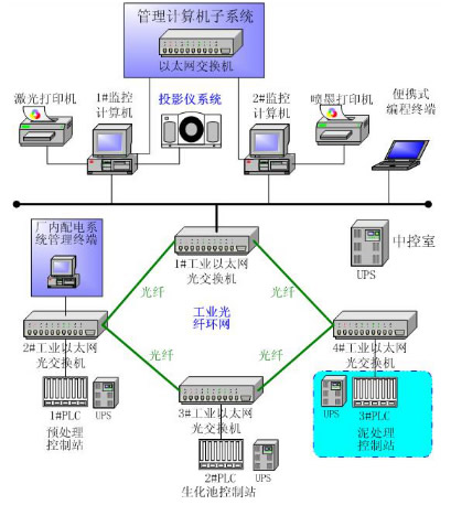 此污水處理廠工程的監(jiān)控系統(tǒng)由PLC、計算機控制管理系統(tǒng)組成的上端系統(tǒng)和儀表檢測系統(tǒng)兩部分組成,其中上端系統(tǒng)中的管理計算機子系統(tǒng)由數(shù)據(jù)服務(wù)器、生產(chǎn)管理及辦公計算機、網(wǎng)絡(luò)交換機、打印機等組成;監(jiān)控計算機子系統(tǒng)由兩臺中央監(jiān)控計算機、投影儀系統(tǒng)、打印機、工業(yè)網(wǎng)絡(luò)交換機組成。